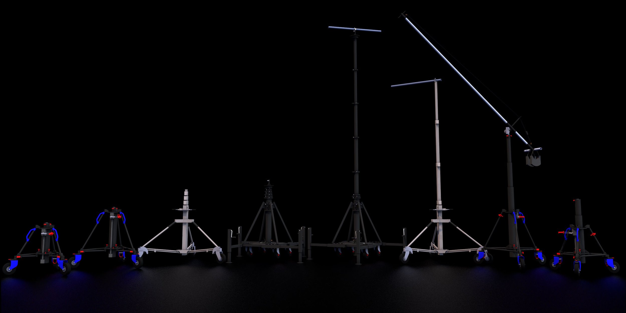Similar to above, a collection of larger stands used in lighting/grip. Options for type of stand, height, and some arms.